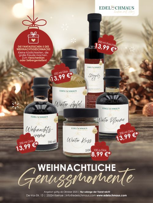 Die Weihnachtszeit wird lecker mit unseren würzig schmackhaften Weihnachtsprodukten Steinpilz Öl, Weihnachtscreme, Winter Apfel, Winter Kuss und Winter Pflaume.