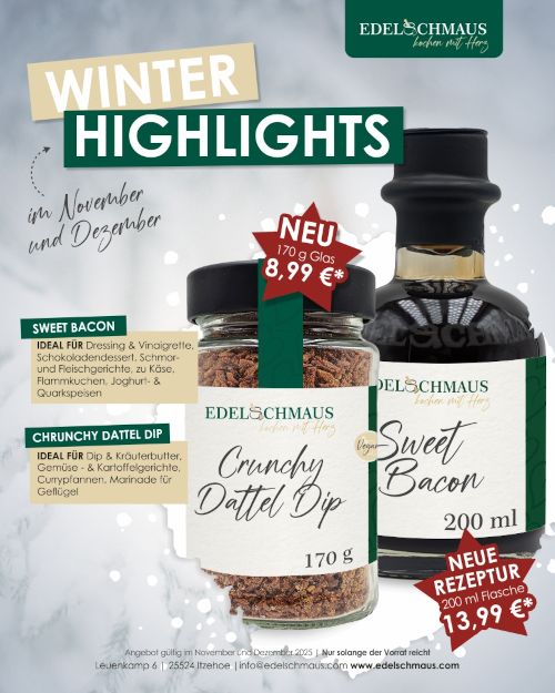 Unser Crunchy Dattel Dip kombiniert die natürliche Süße sonnengereifter Datteln mit aromatischen Gewürzen und einem köstlichen Crunch. Unser beliebtes Sweet Bacon ist wieder da. Es vereint süß, rauchig und herzhaft zu einem Geschmackserlebnis, das jedes Gericht veredelt.